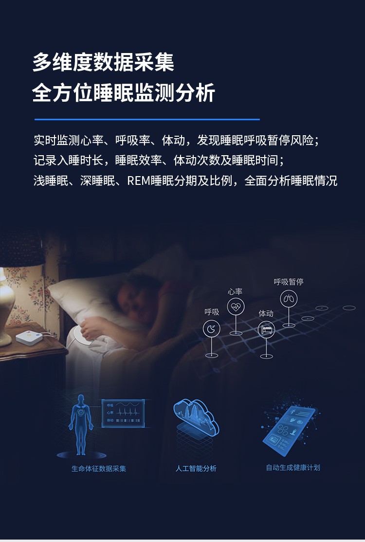• 通過非接觸(無擾)、無輻射、精準連續(xù)采集心搏、呼吸、體動信息(不收集個人任息),可敏感發(fā)現(xiàn)用戶睡眠過程中的心率變異、呼吸暫停事件,通過個人海量大數(shù)據(jù)的采集結(jié)合海量數(shù)據(jù)挖掘得出的醫(yī)學(xué)模型;結(jié)合個人數(shù)據(jù)衍生出個體化健康模型,進一步提供健康評估、疾病預(yù)警、健康指導(dǎo),傳播科學(xué)、健康生活觀念。